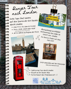Neben einer Sightseeing-Tour durch London steht auch ein Besuch im Girl Guide Shop auf dem Programm. Du gestaltest mit. Welche Themen interessieren dich? Welche Orte möchtest du sehen? Welche Programmideen bringst du mit? Deine Ideen sind ausdrücklich erwünscht.