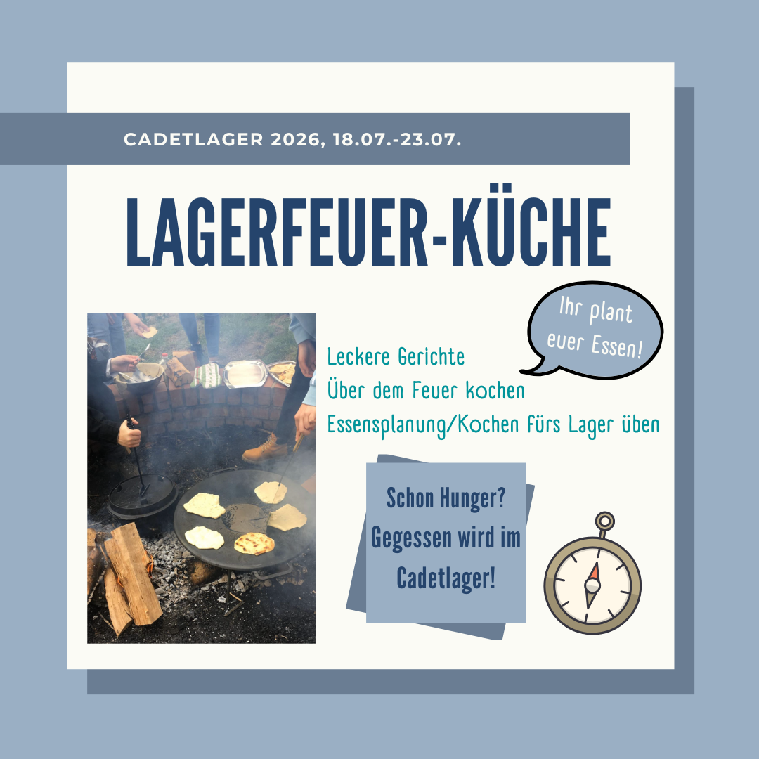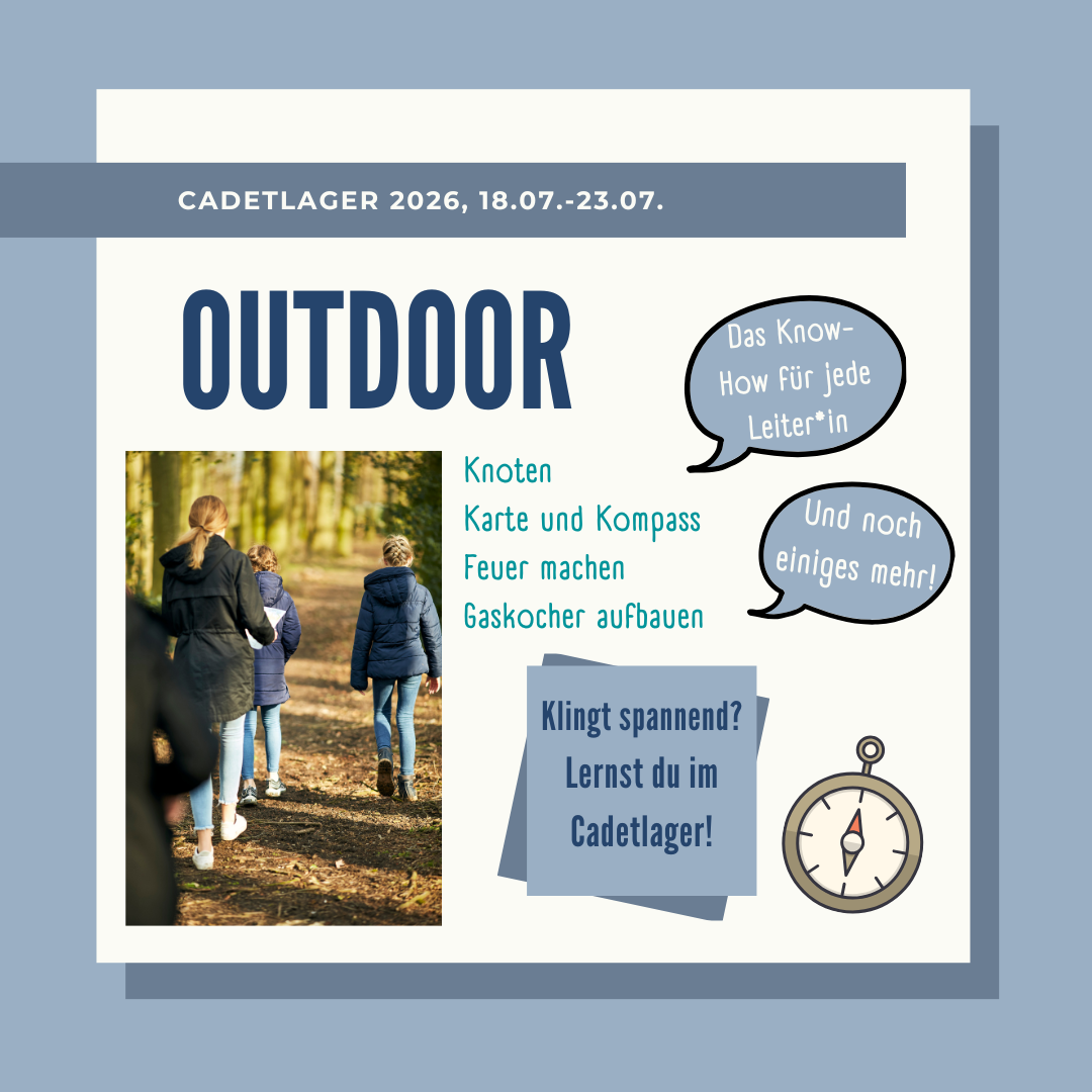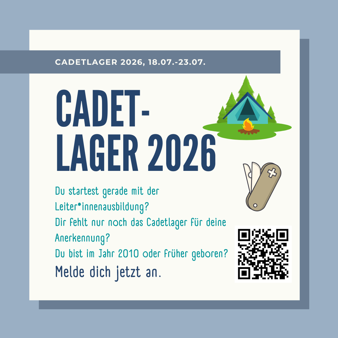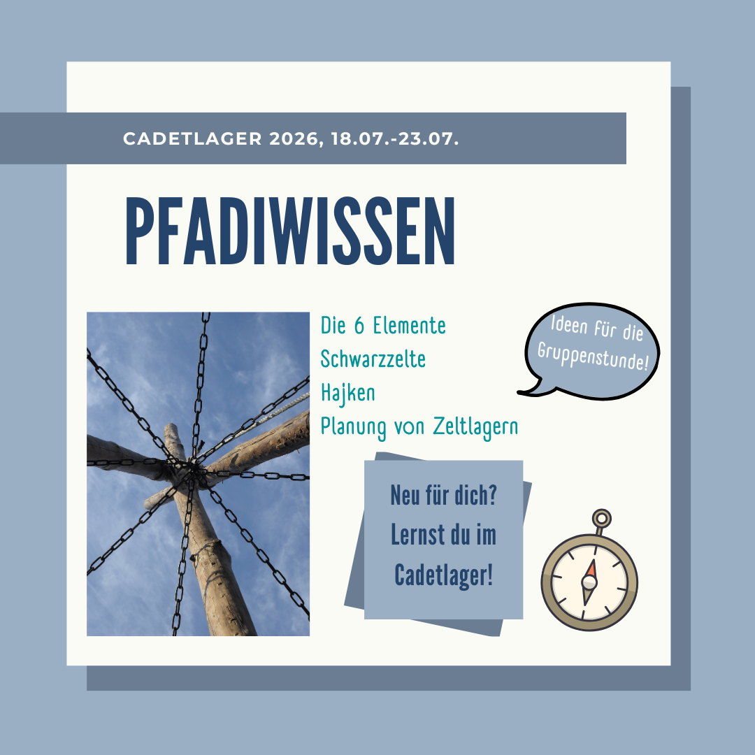 Vom 18.07. - 23.07. lernst du hier praxisnah, was es als Pfadfinder*in braucht. Ob als Teil deiner Leiter*innenausbildung oder einfach nur, um deine Kenntnisse aufzufrischen, wir werden beim Cadetlager eine tolle Zeit haben. Also jetzt schnell anmelden.