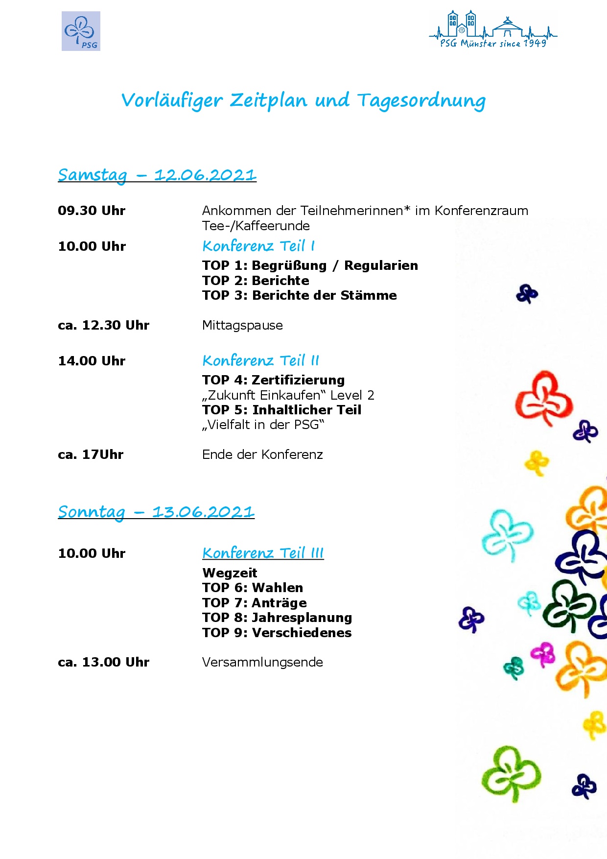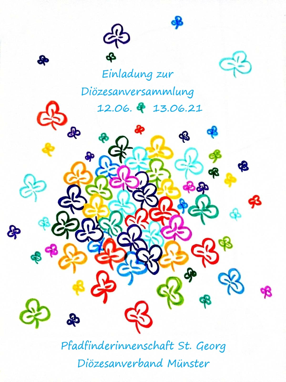 mit einem bunten Kleeblattgruß laden wir euch ganz herzlich zur diesjährigen Diözesanversammlung der PSG Münster am 12. & 13. Juni 2021 ein. Aufgrund der anhaltenden Kontaktbeschränkungen und des unabsehbaren Verlaufs der Pandemie, haben wir uns entschieden die Versammlung digital stattfinden zu lassen. Trotzdem erwarten wir eine bunte und vielfältige Versammlung mit euch, denn rund um Berichte, Austausch und Wahlen werden wir uns mit dem Thema Vielfalt in der PSG beschäftigen.