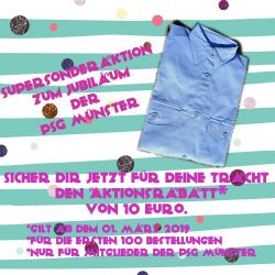 Sichere dir jetzt zum Jubiläum der PSG Münster für deine Tracht den Aktionsrabatt von 10 Euro. Der Rabatt gilt ab dem 01. März 2019 für die ersten 100 Bestellungen und gilt nur für Mitglieder der PSG Münster.